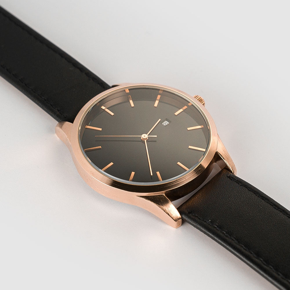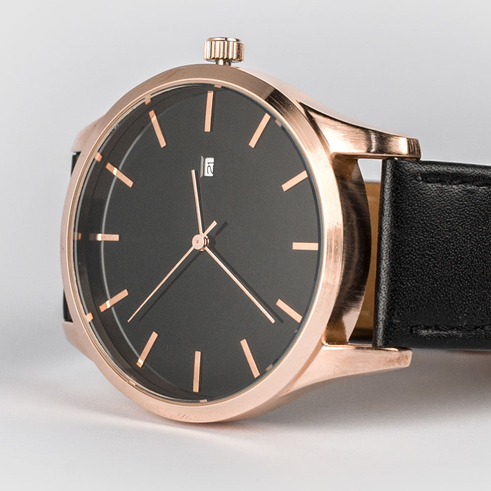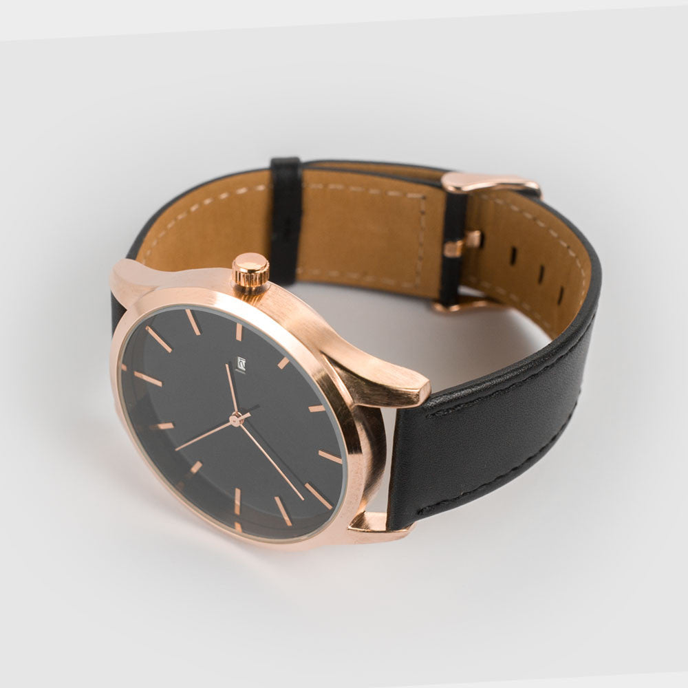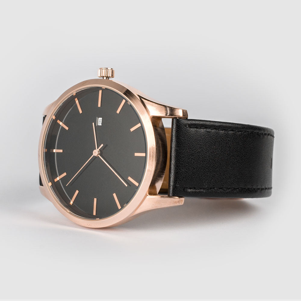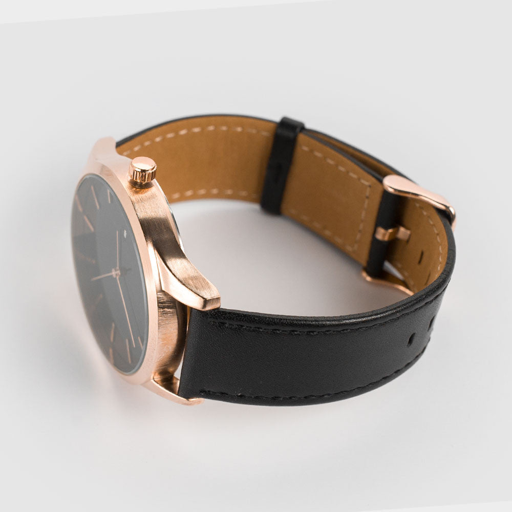 It's plated by a classic rose gold coated case made of brushed stainless steel, and has a black dial with minimalist rose gold hour markers, topped off by color coordination brilliance in the form of comfortable black leather straps with buckle closure.